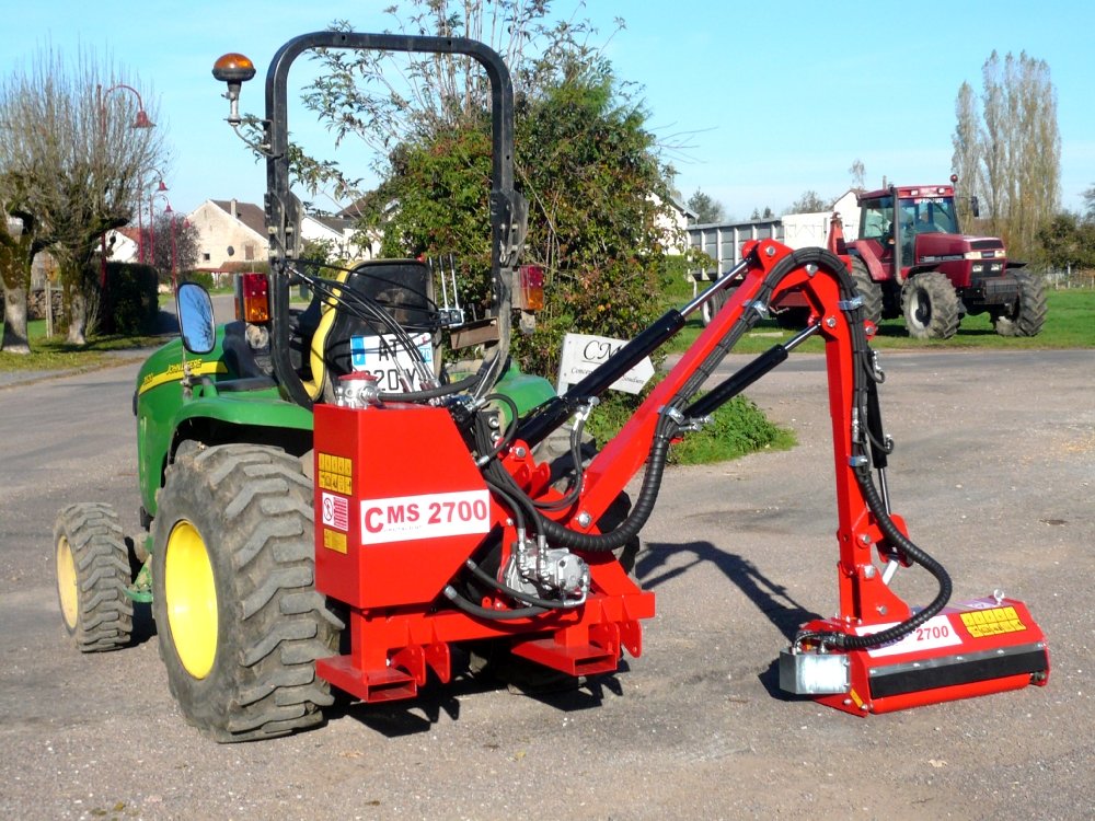 Epareuse débroussailleuse modèle CMS 2700 spécialement conçu pour le nettoyage des fossés, des bords de route, des digues, des vignes, des haies, des parcs et jardins, des talus… Convient parfaitement aux micro-tracteurs et aux tracteurs à voie étroite. Epareuse CMS 2700 : – Portée de 2,70 m – Rotor de 80 cm – Puissance de la pompe : 23 cv – Réservoir d’huile hydraulique : 48 L (fournie) – Sécurité du bras : mécanique – Fonctionnement sur PDF tracteur 540 trs/min – Commandes téléflexibles – Position Flottante du rotor de série – Attelage 3 points – Puissance de tracteur conseillée : 15/25 cv – Poids : 310 kg Dimensions en mm : – A : 2700 – B : 2400 – C : 2200 – D : 3000 – E : 1600 – F : 1900 – G : 800