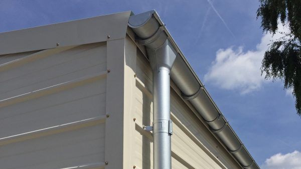 Ensemble de gouttières et tuyaux de descente en acier dans les couleurs RAL 9022 (gris clair) ou RAL 7016 (anthracite), largeur de la gouttière 125 mm, diamètre du tuyau de descente 80 mm.