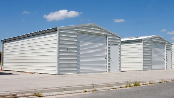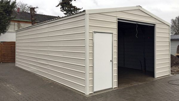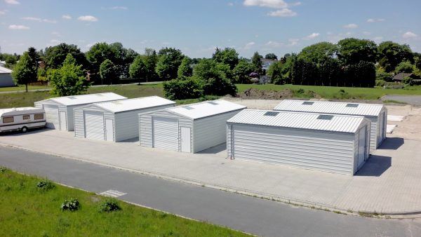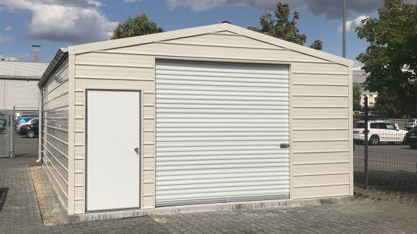De manière standard, le hangar est fourni avec une porte roulante et une porte d’entrée situées dans la paroi avant.