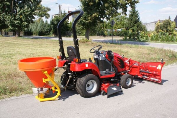 Les modèles présentés en photos 2, 3 et 4 montrent son utilisation avec des accessoires optionnels : option tondeuse ventrale (1,37 m de large), chargeur frontal et épandeur arrière.